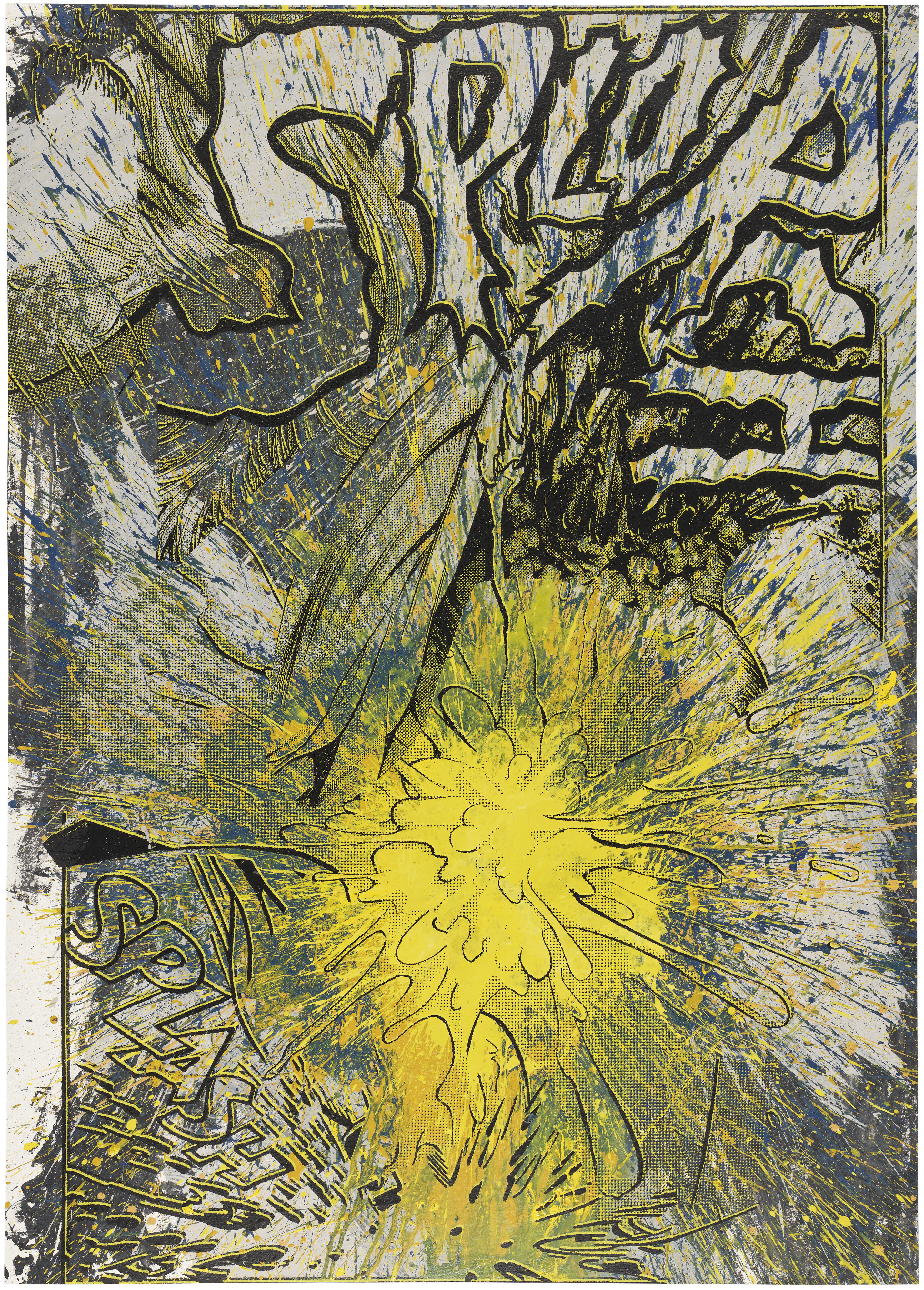 Unique monoprint comprising screenprint in colors with extensive hand-painted acrylic, on board, the full sheet