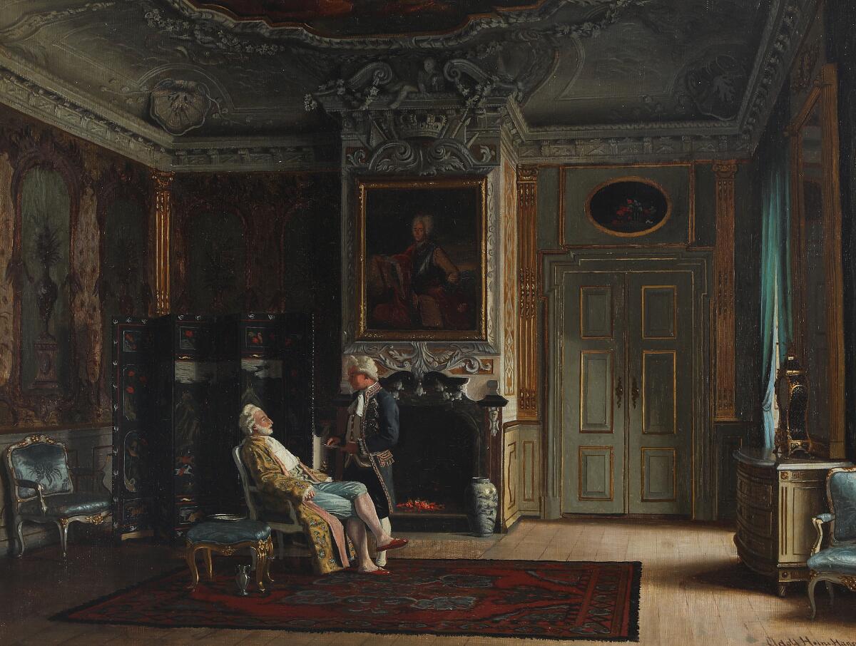Interior from Fredensborg Castle with an elegant gentleman about to be shav...
