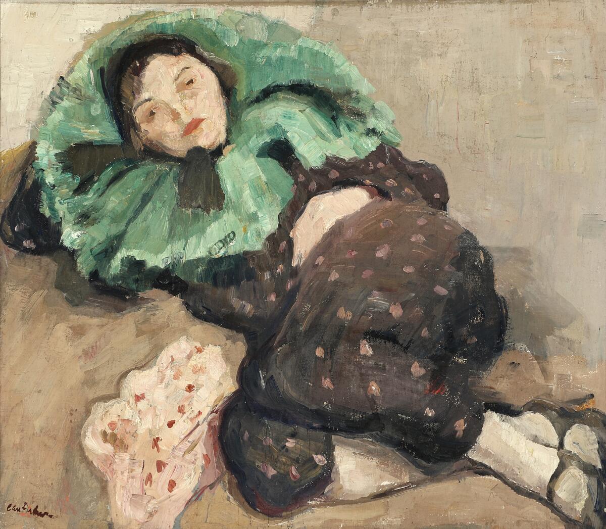 Reclining female model in a dotted suit and a large green collar
