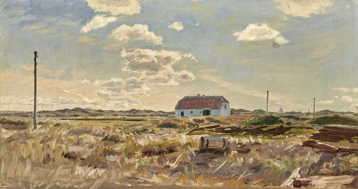 View of the heath and Den tilsandede Kirke (the sand-covered church) in the...