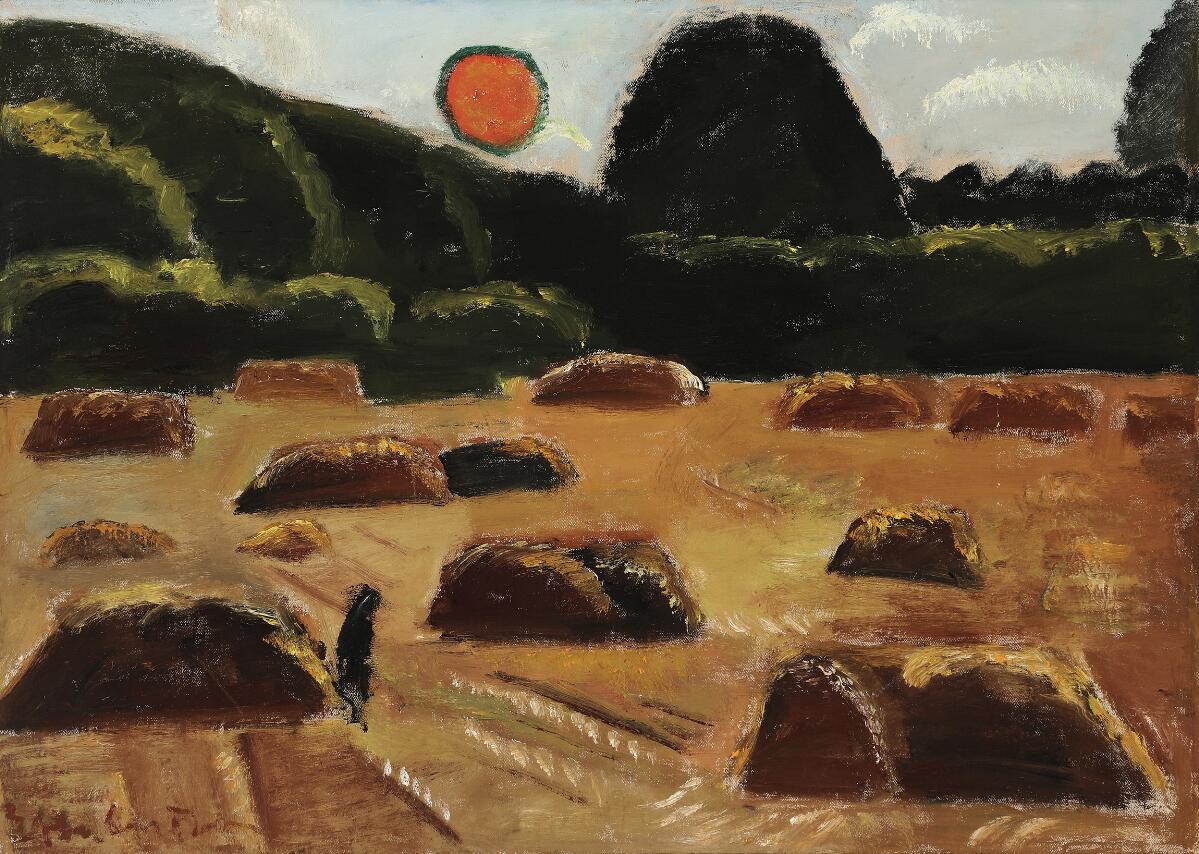 Harvest scene with orange sun
