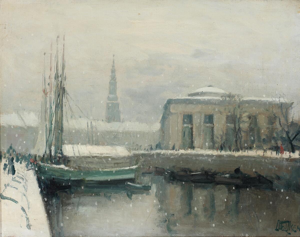 Winter scenery from Copenhagen with a view towards Thorvaldsen's Museum, in...
