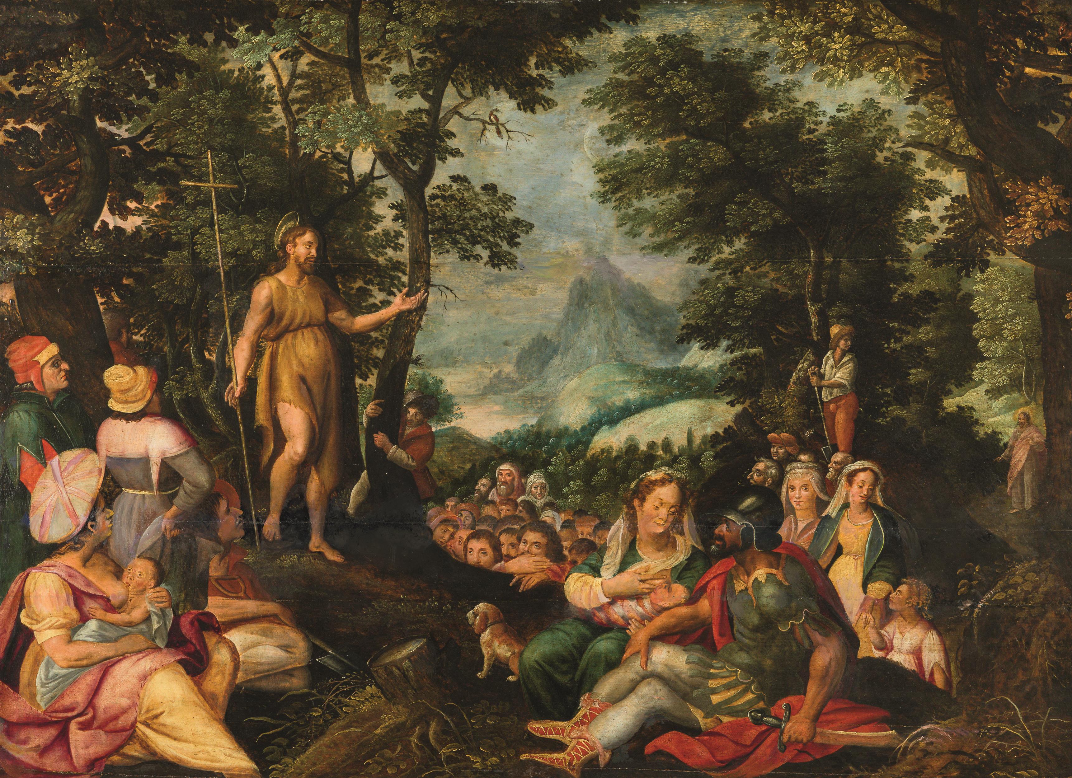 Die Predigt Johannes des Täufers in bewaldeter Landschaft