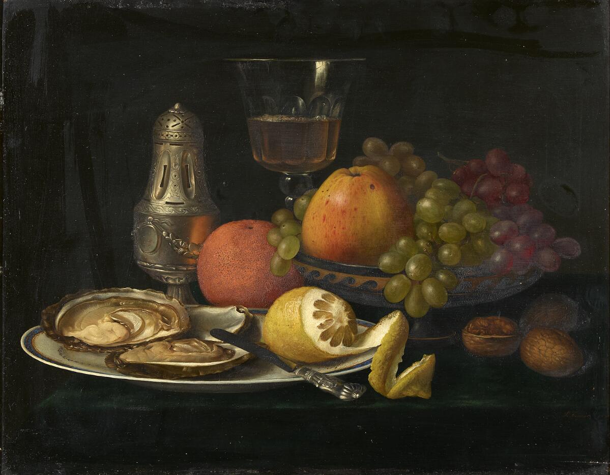 Still life with oysters on a plate and fruit in a bowl