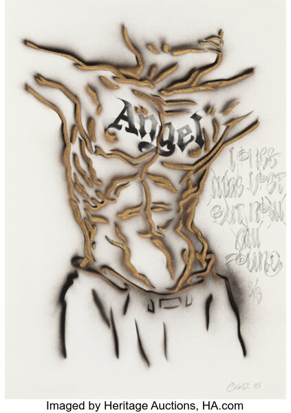 Offset lithograph in colors, spray paint, with hand-embellishments on skate deck