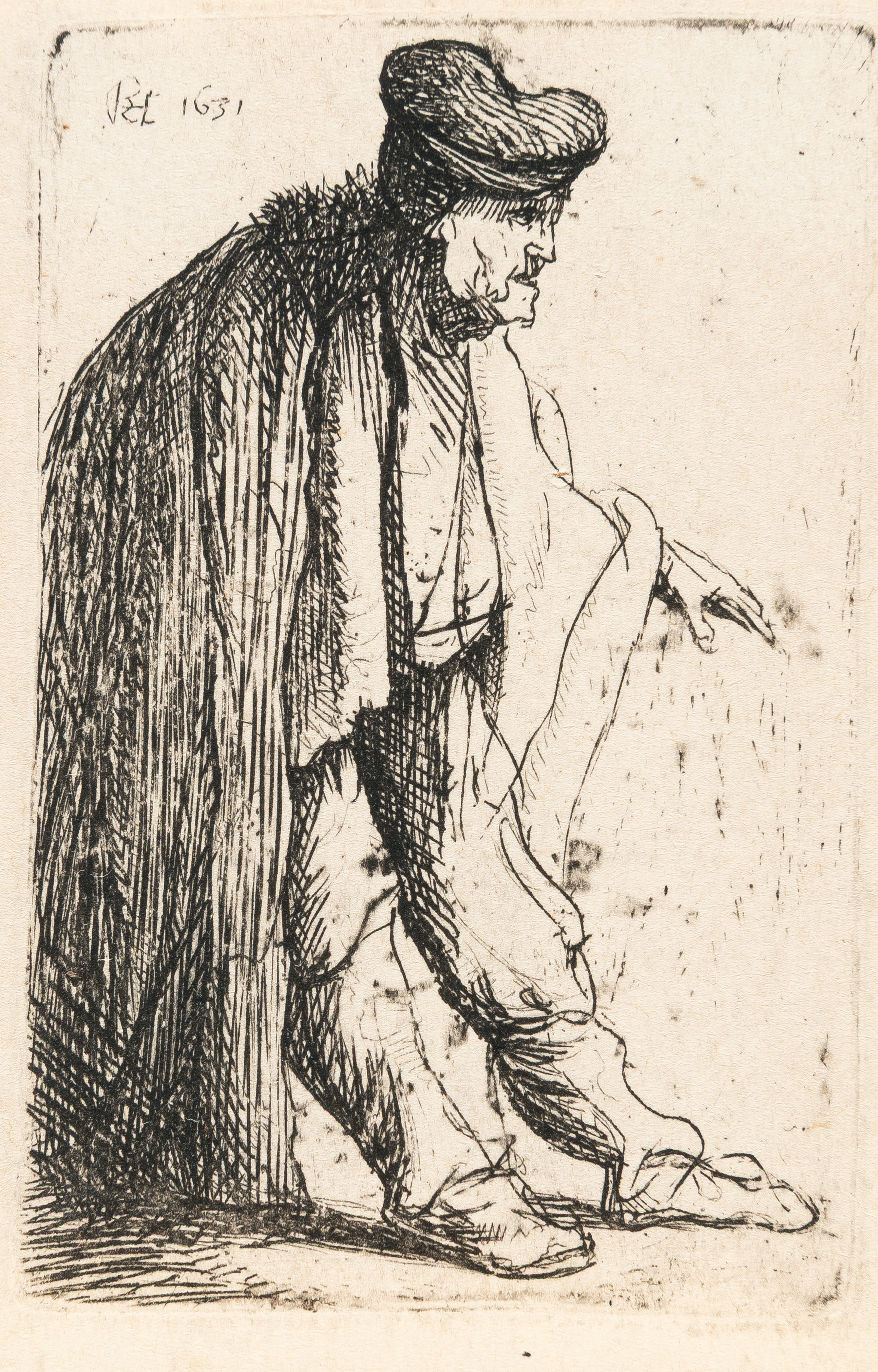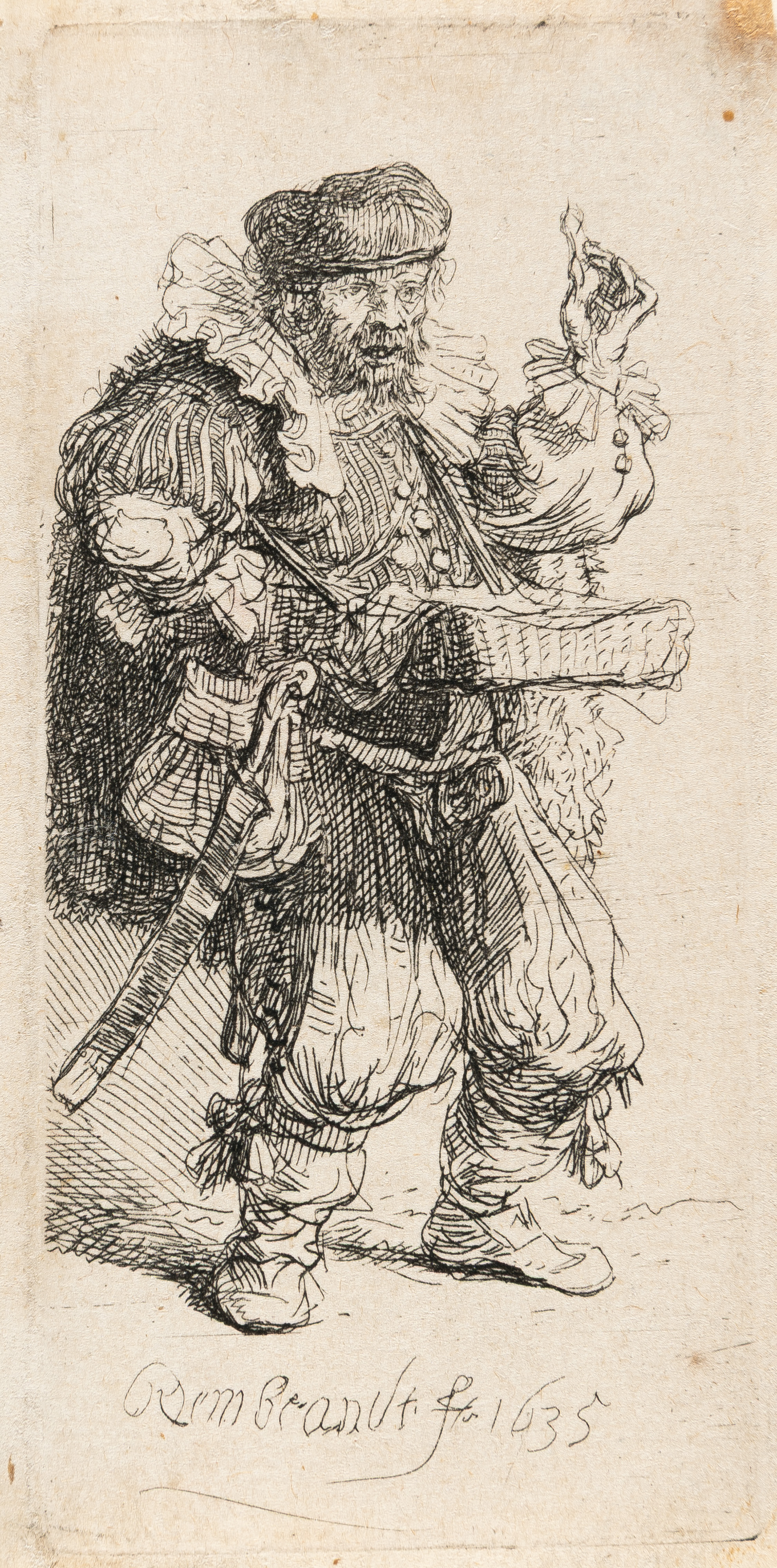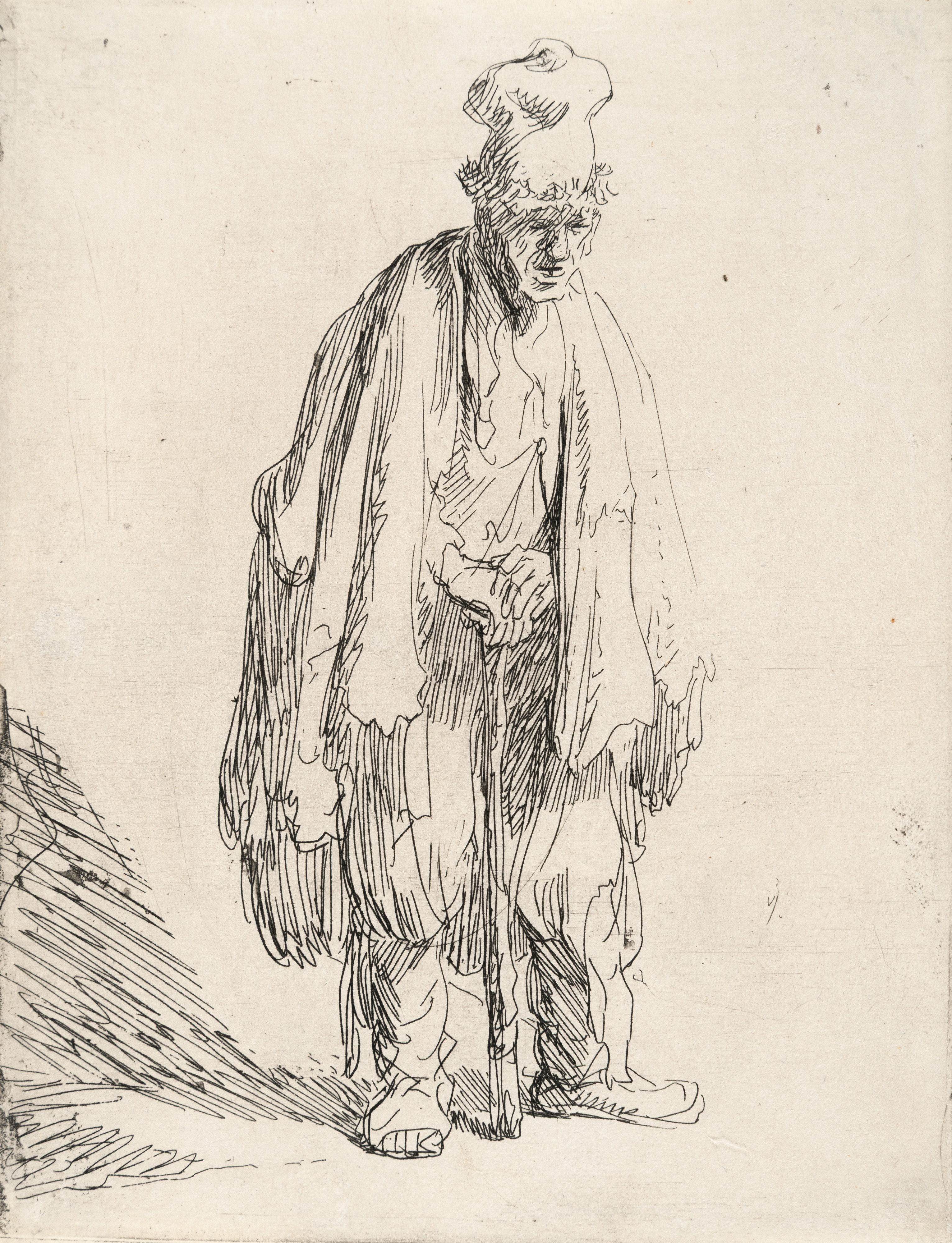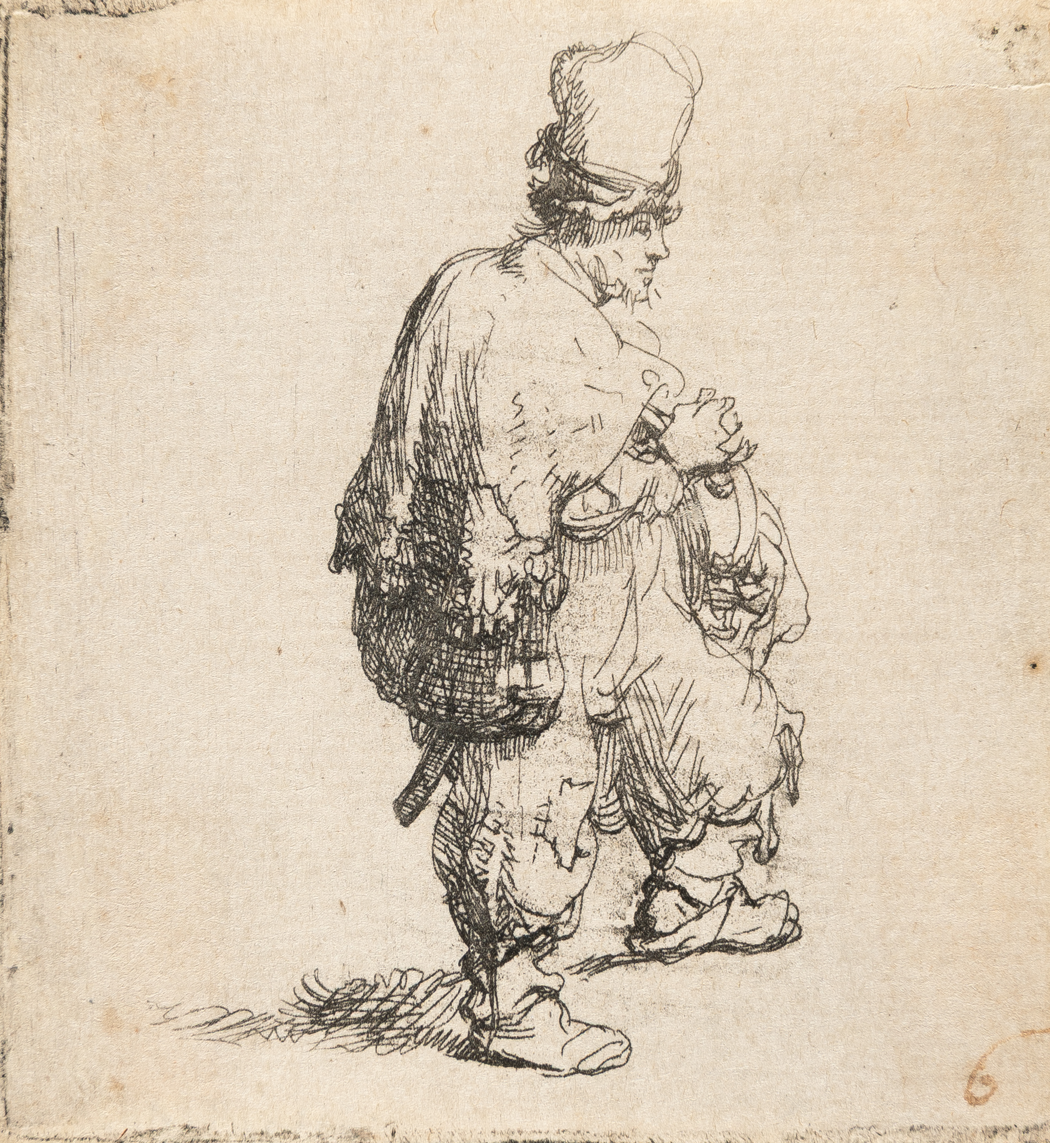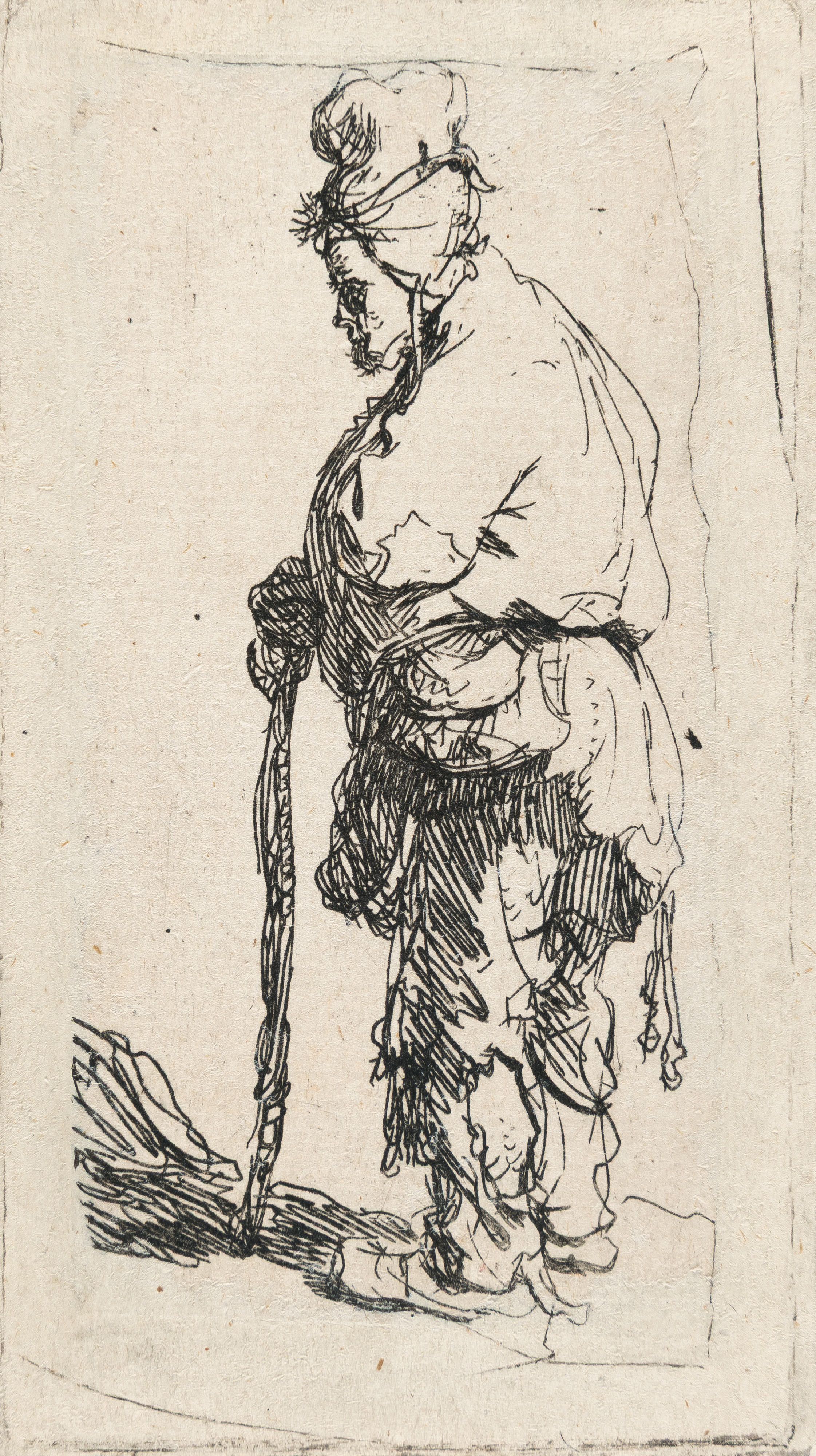 Beggar in a High Cap, Standing and Leaning on a Stick