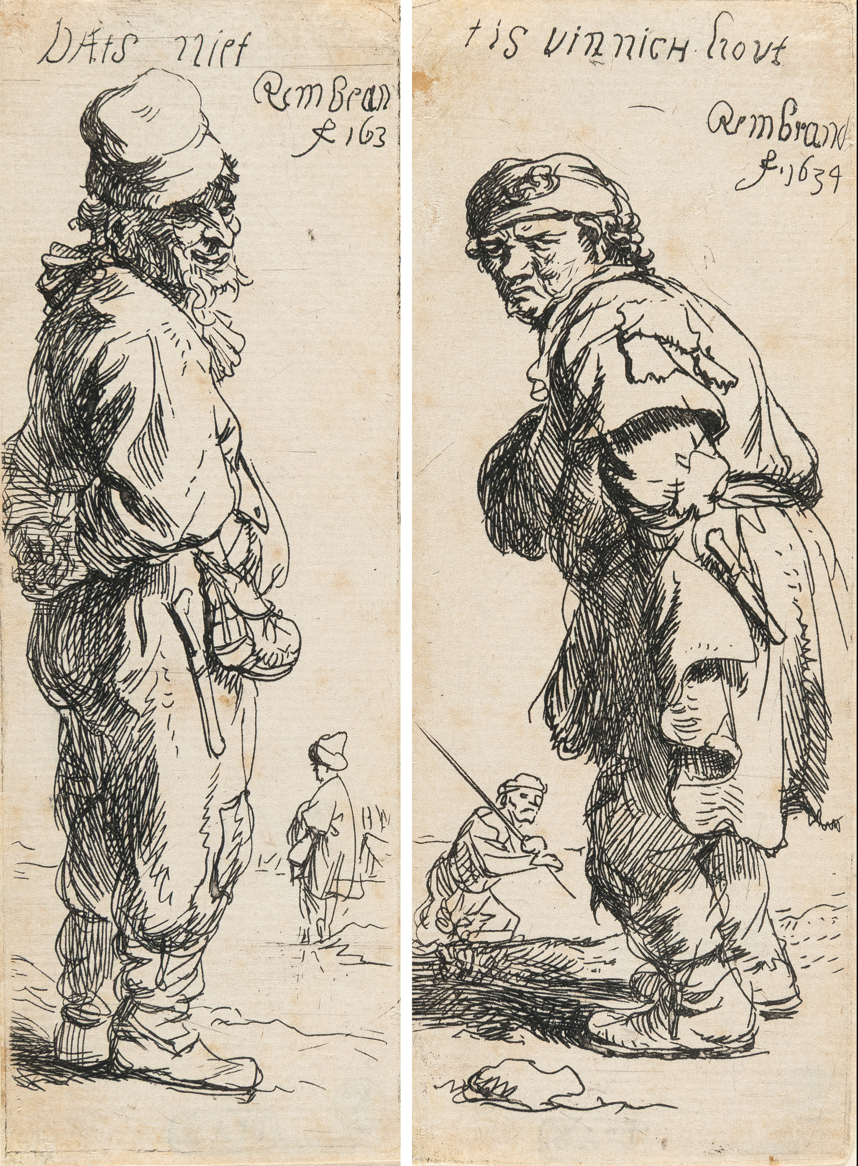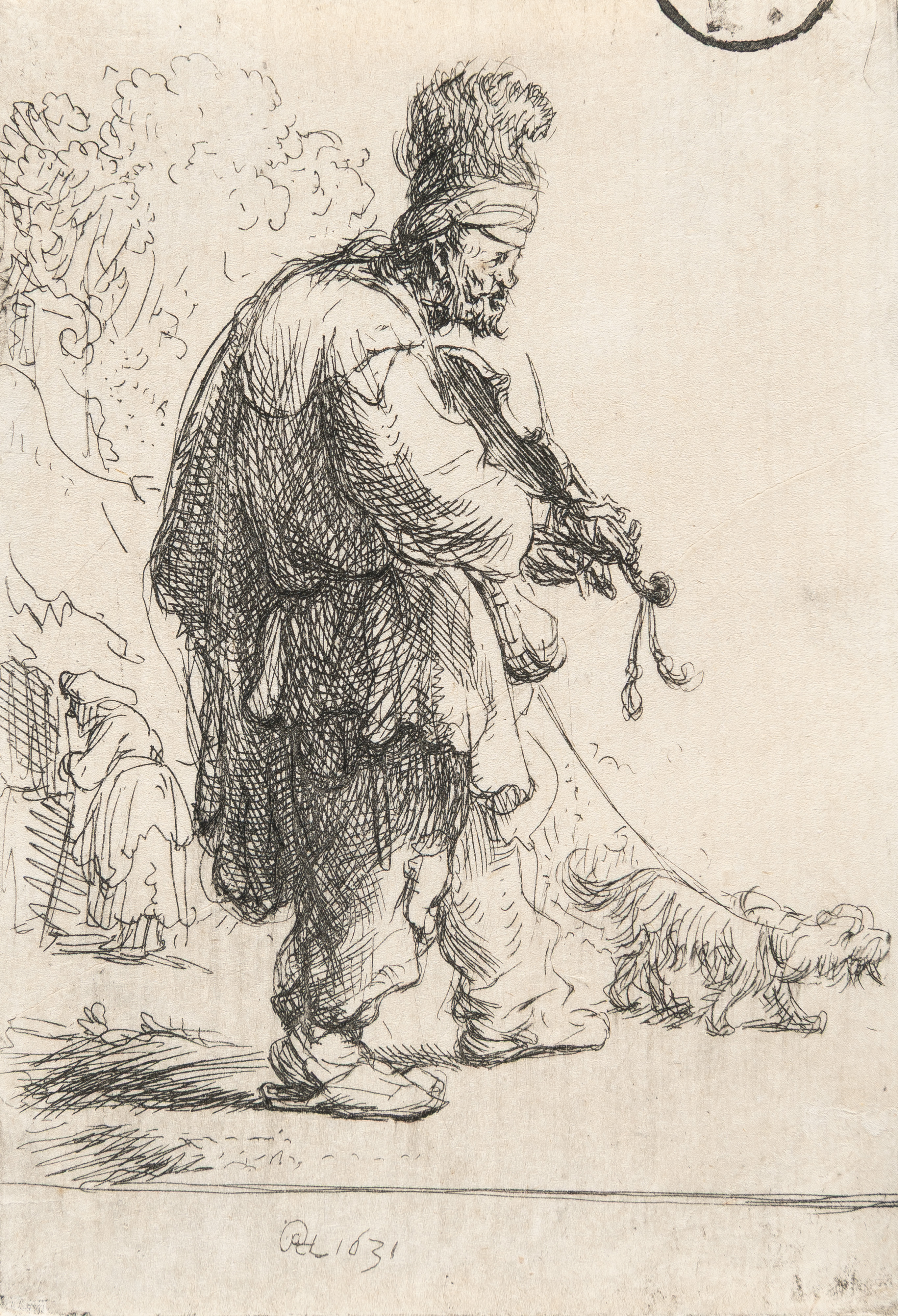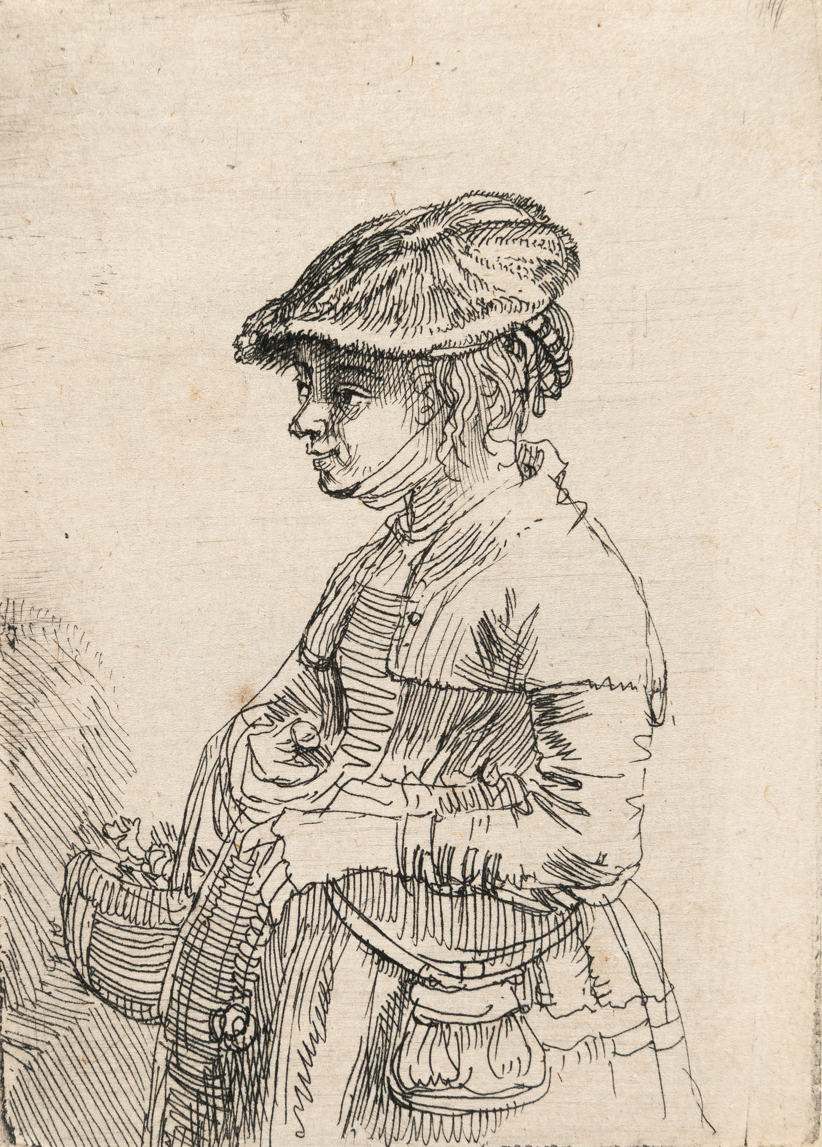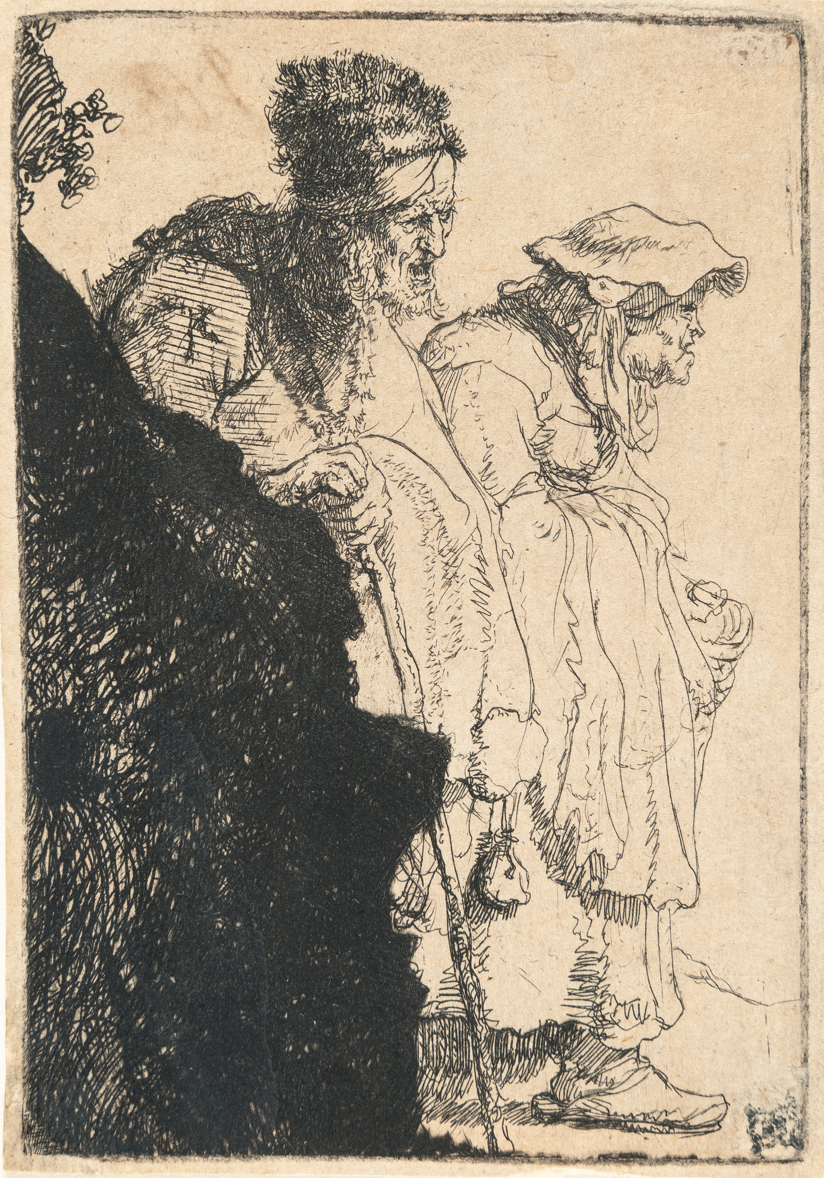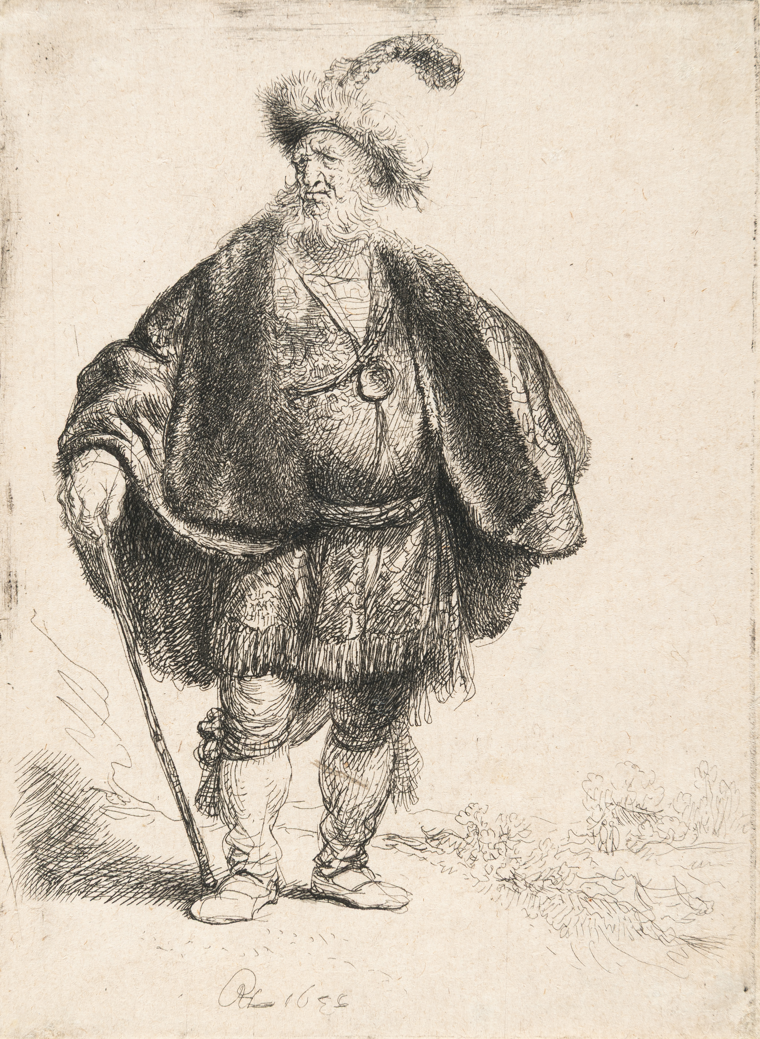 Beggar in a High Cap, Standing and Leaning on a Stick