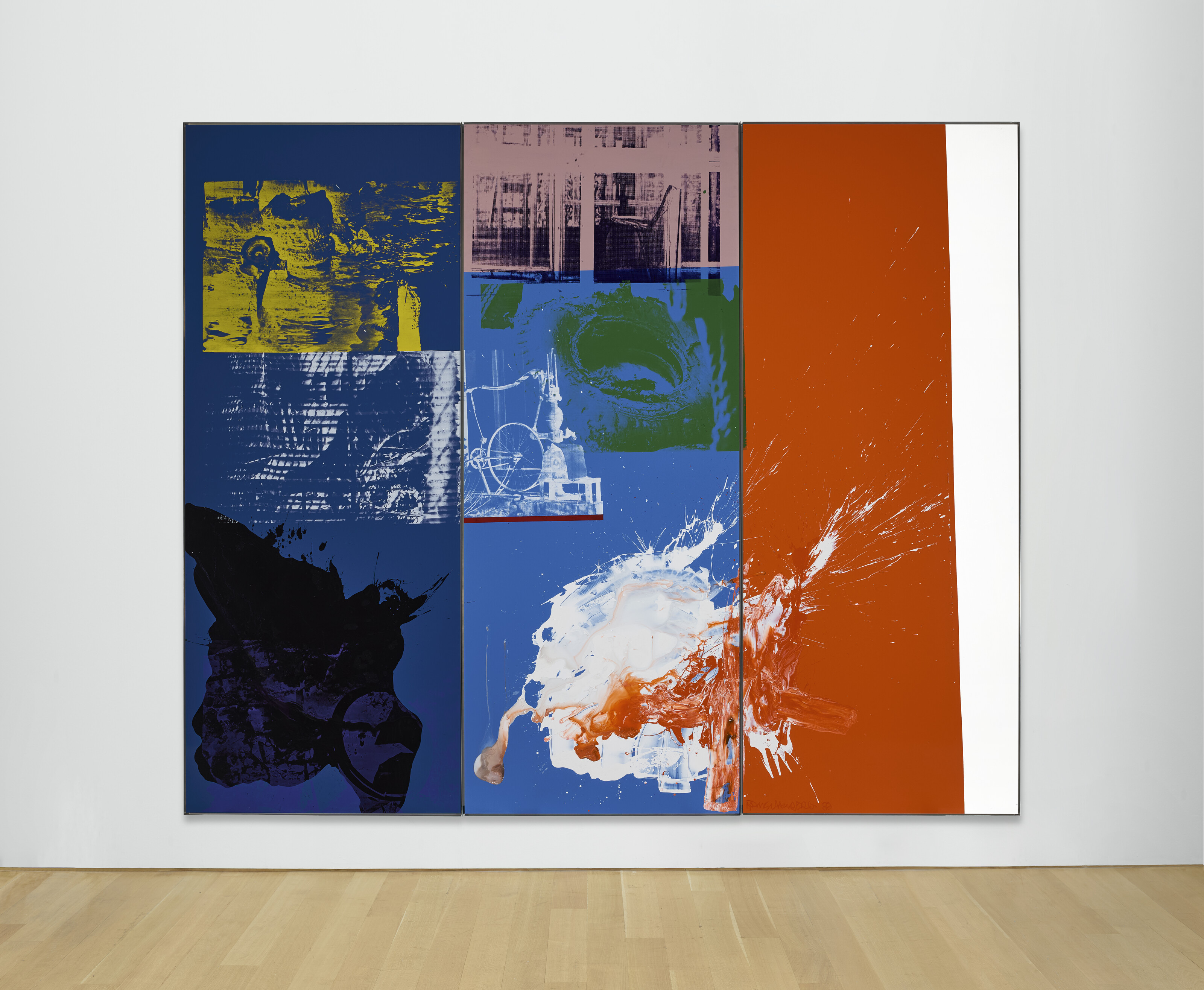 acrylic and silkscreen ink on enameled aluminum, in three parts