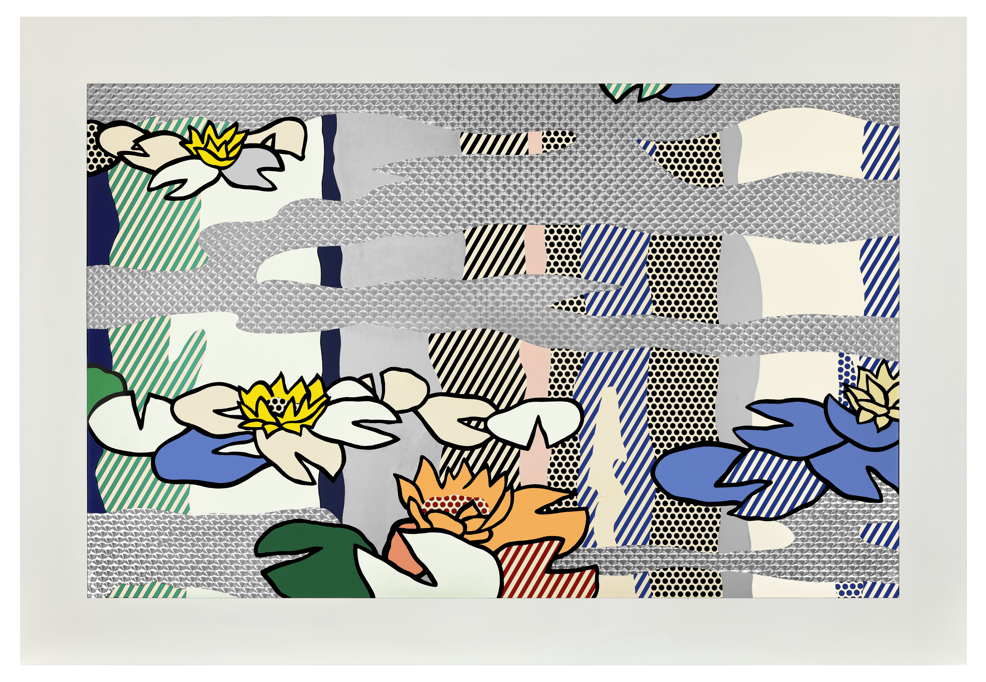 screenprinted enamel on processed and swirled stainless steel, with painted aluminum frame