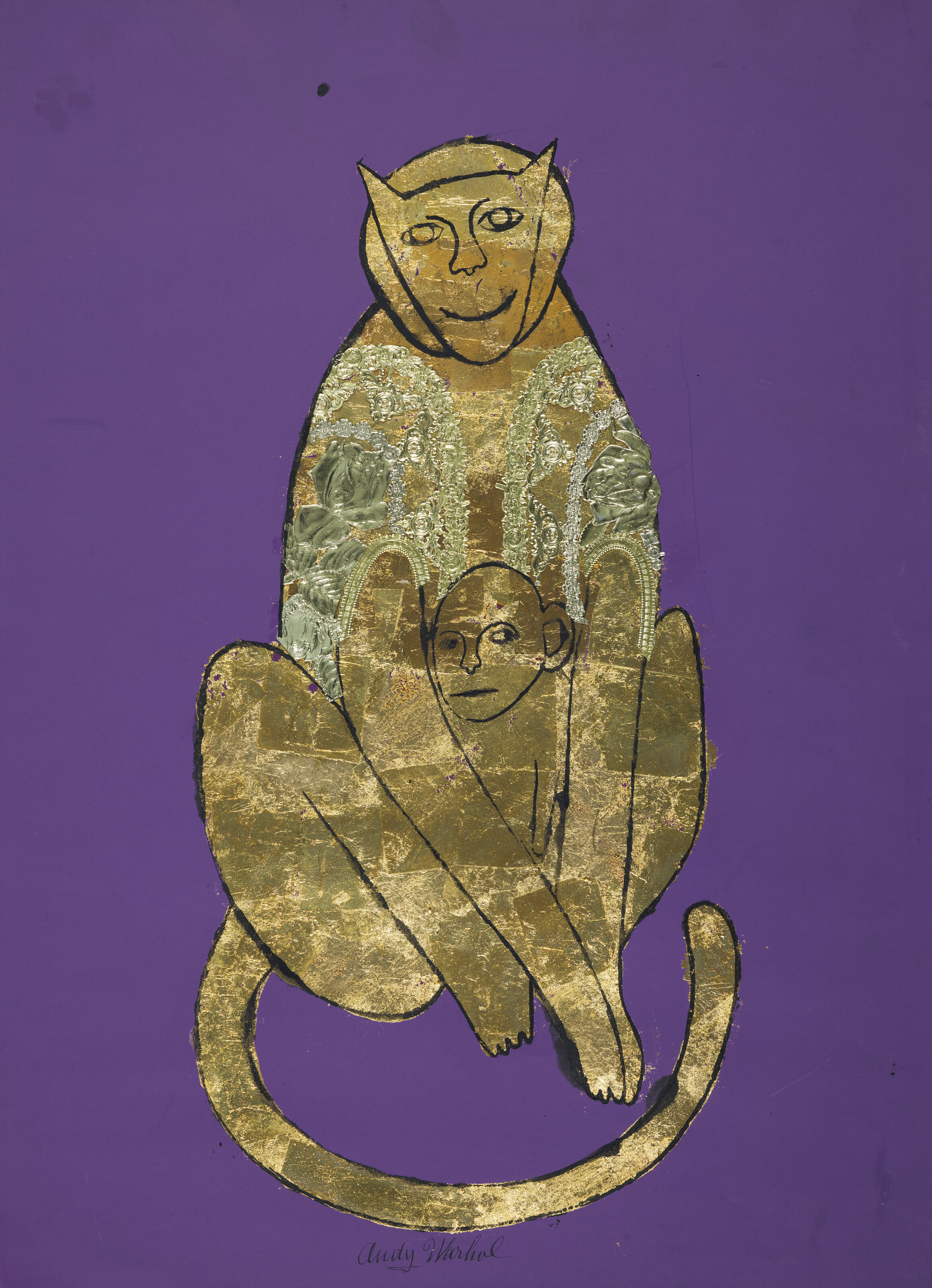 ink, gold leaf and gold appliqué on colored paper