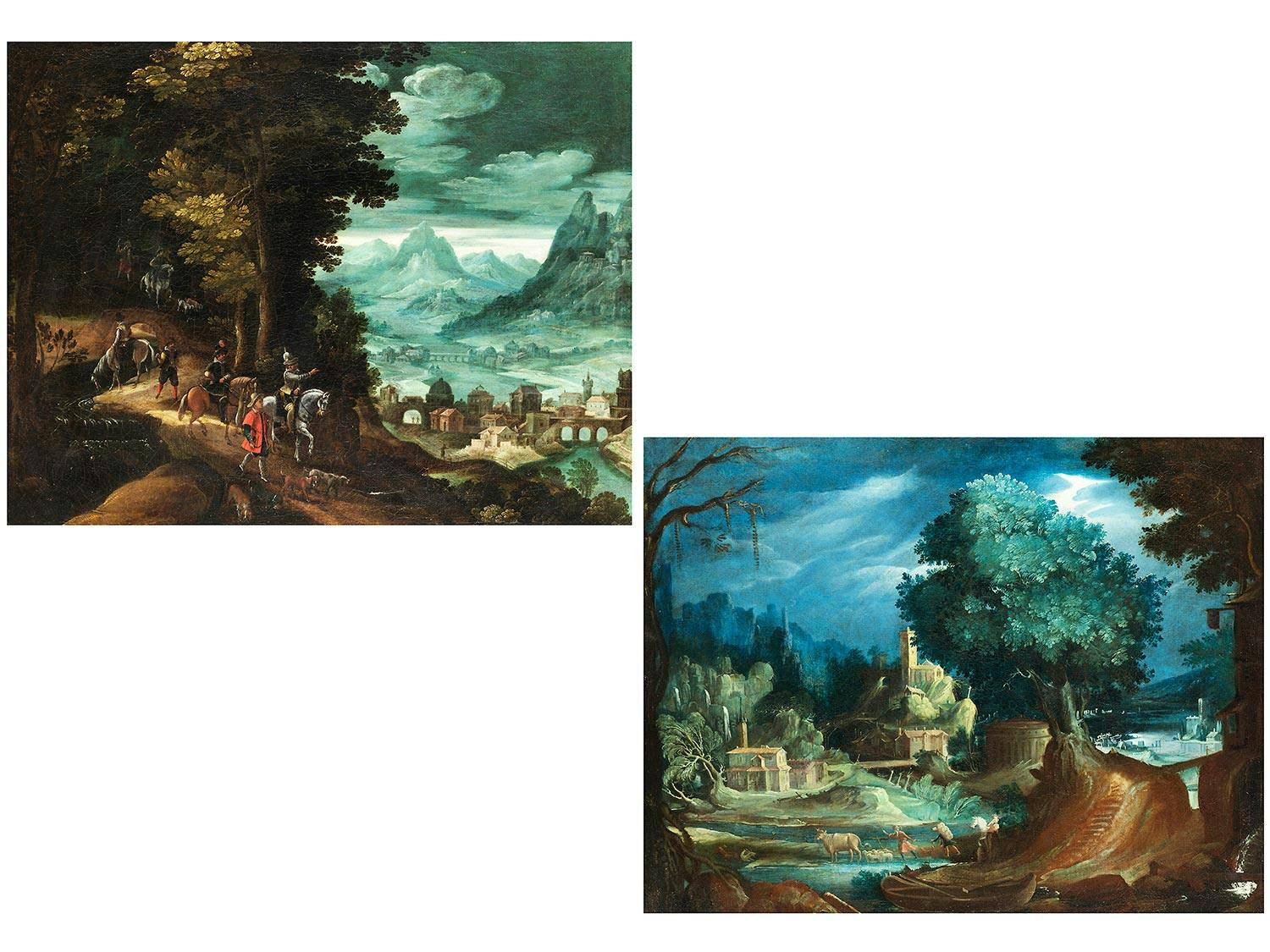 HÜGELLANDSCHAFT MIT REITERN UND STÄDTCHEN IM TAL sowie BAUMLANDSCHAFT IN ...