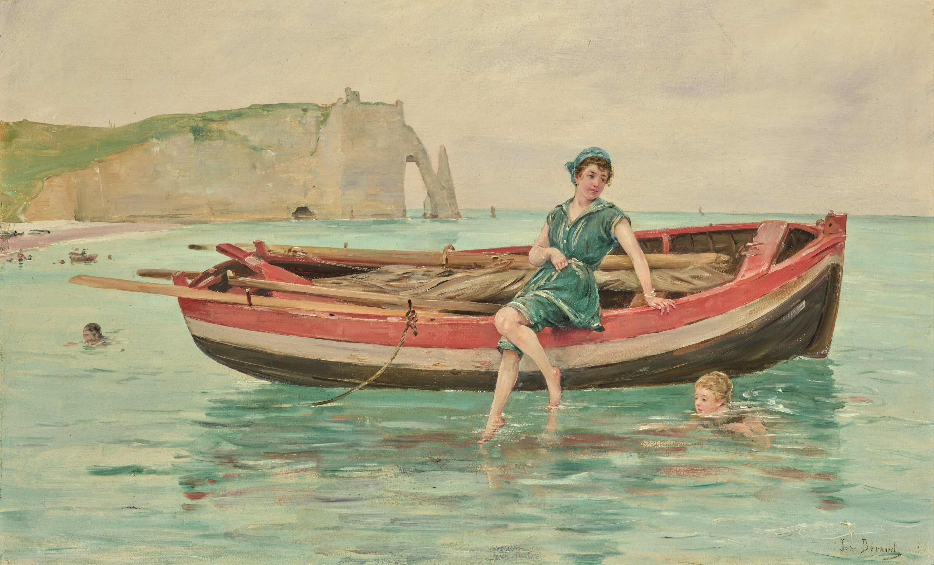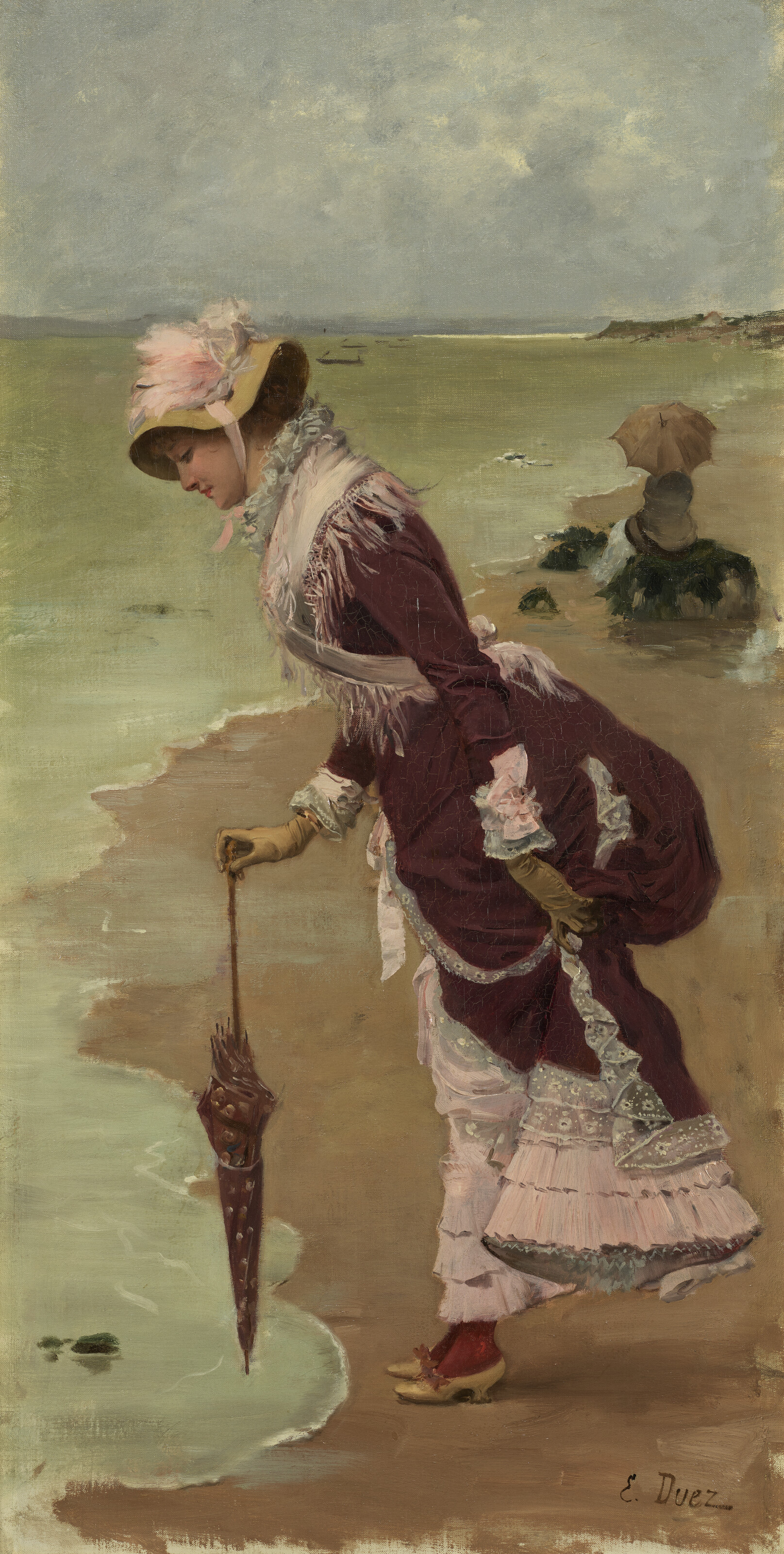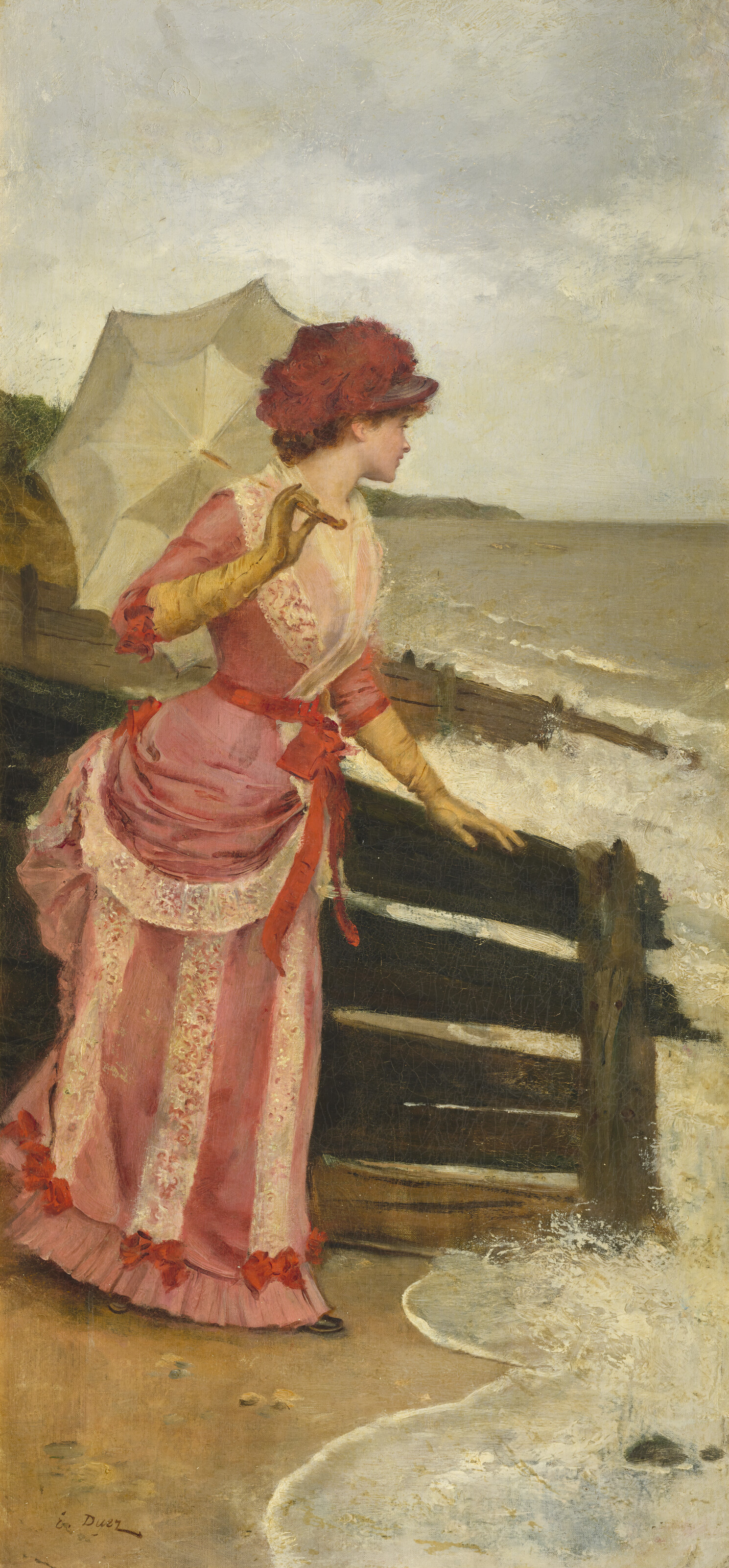 Femme en corsage rouge appuyée sur son ombrelle, près de la mer