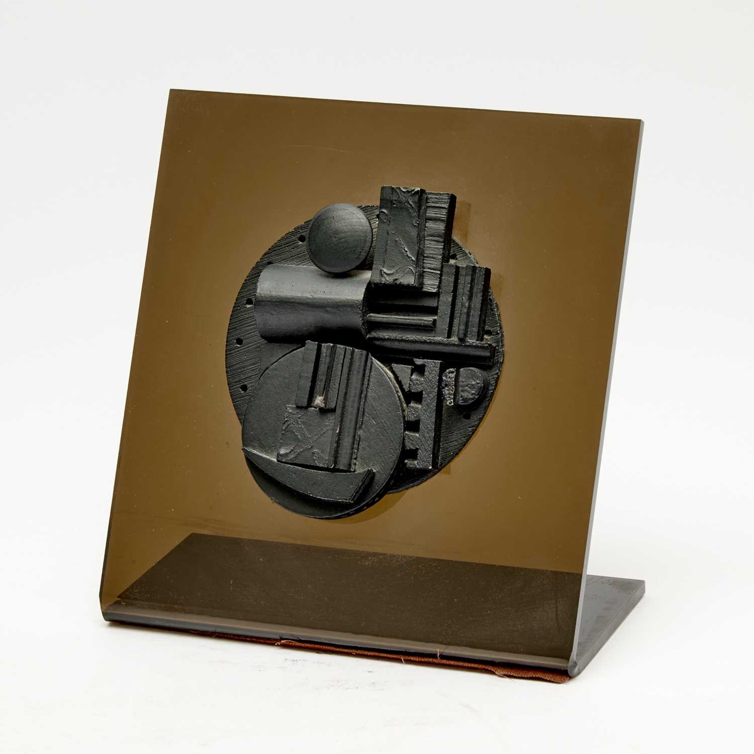 Cast relief multiple in black mounted to smoked Plexiglas stand
