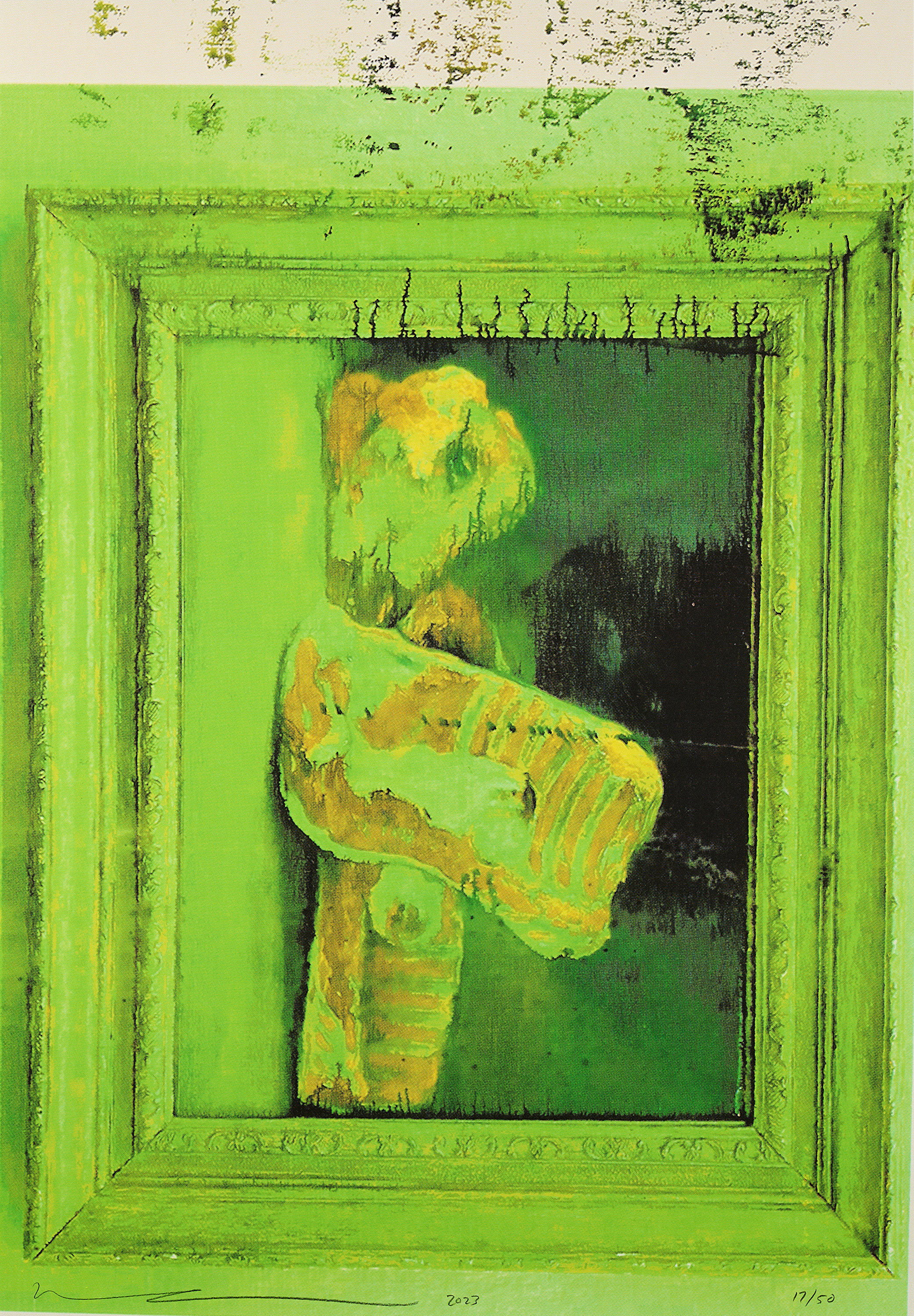 Unique monoprint with collage, engraving, embossing and oil paint in colors, on handmade and hand-dyed Twinrocker paper, the full sheet
