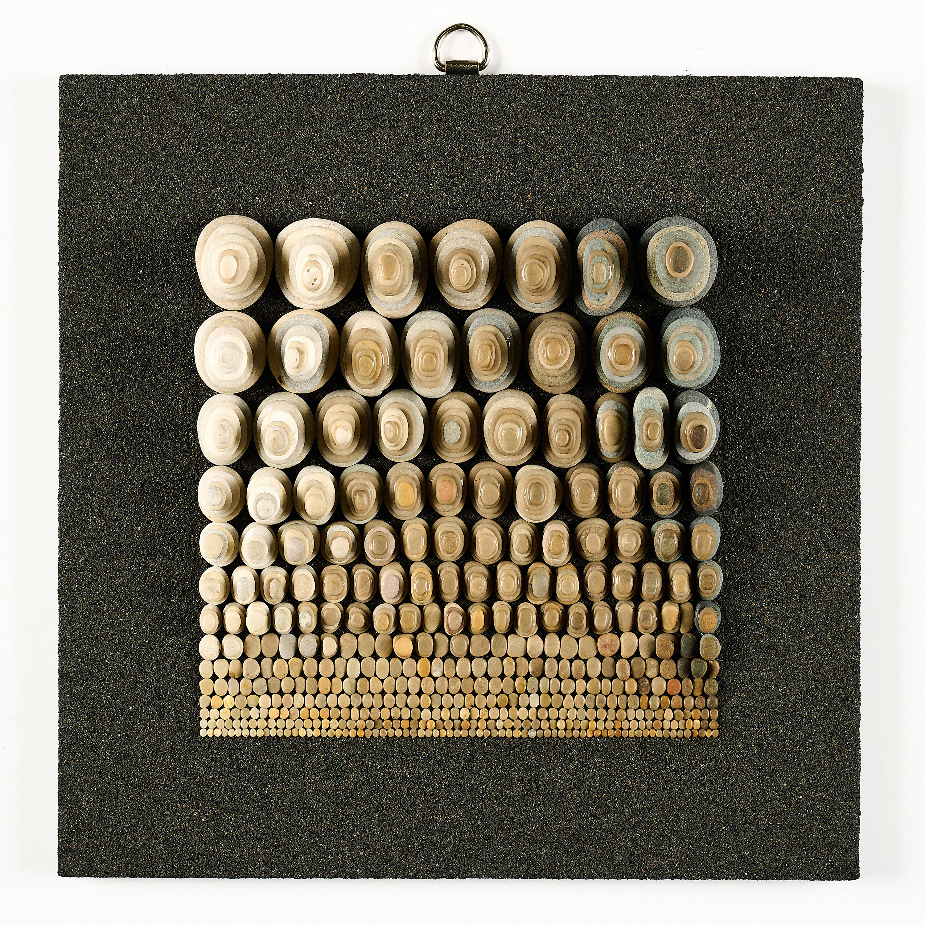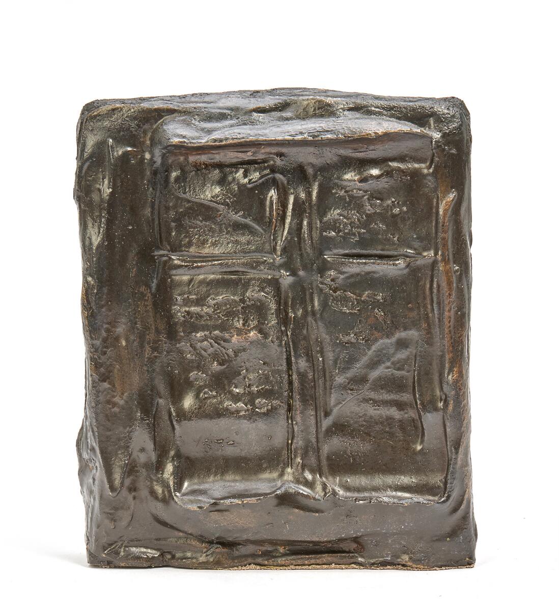 Cast relief multiple in black mounted to smoked Plexiglas stand