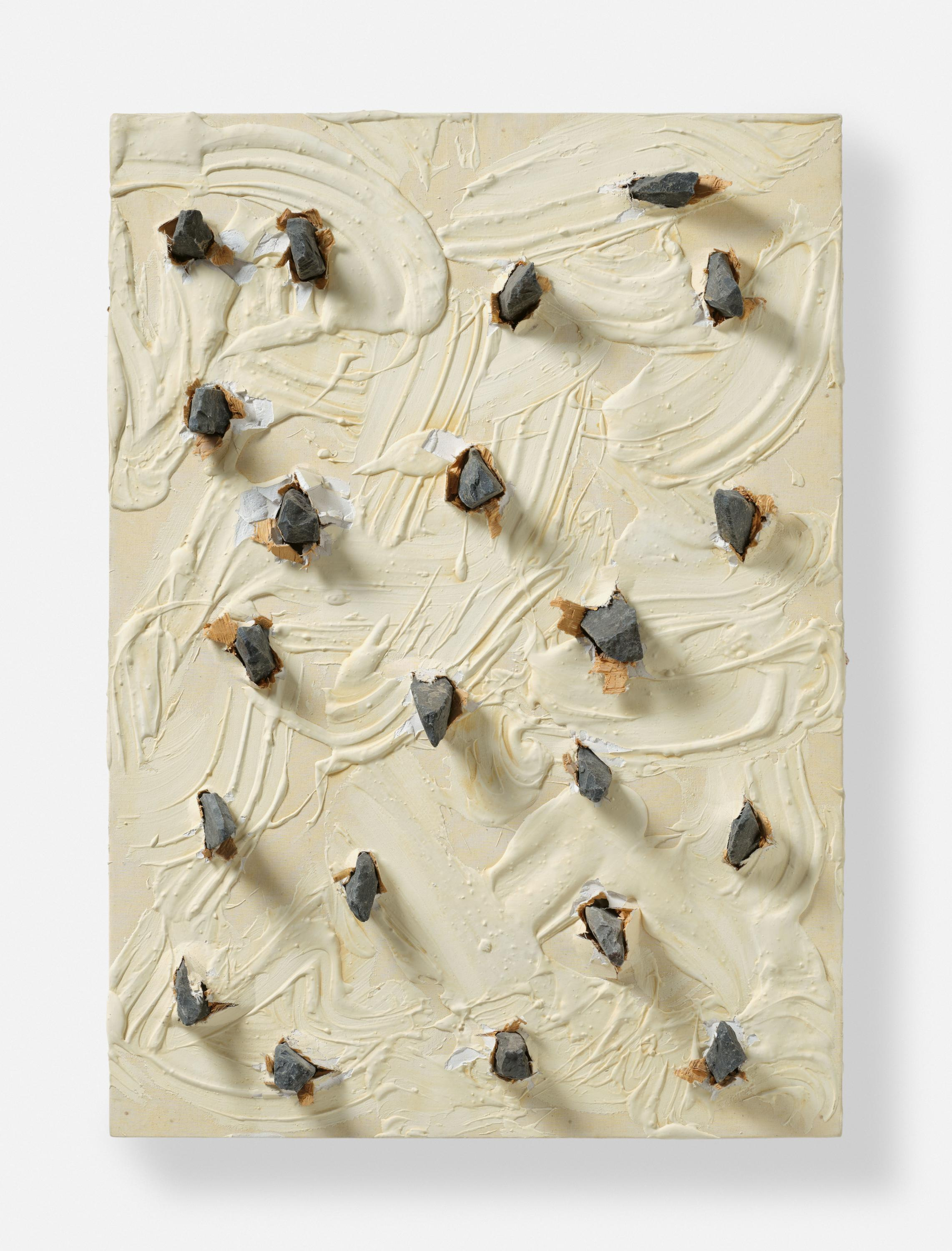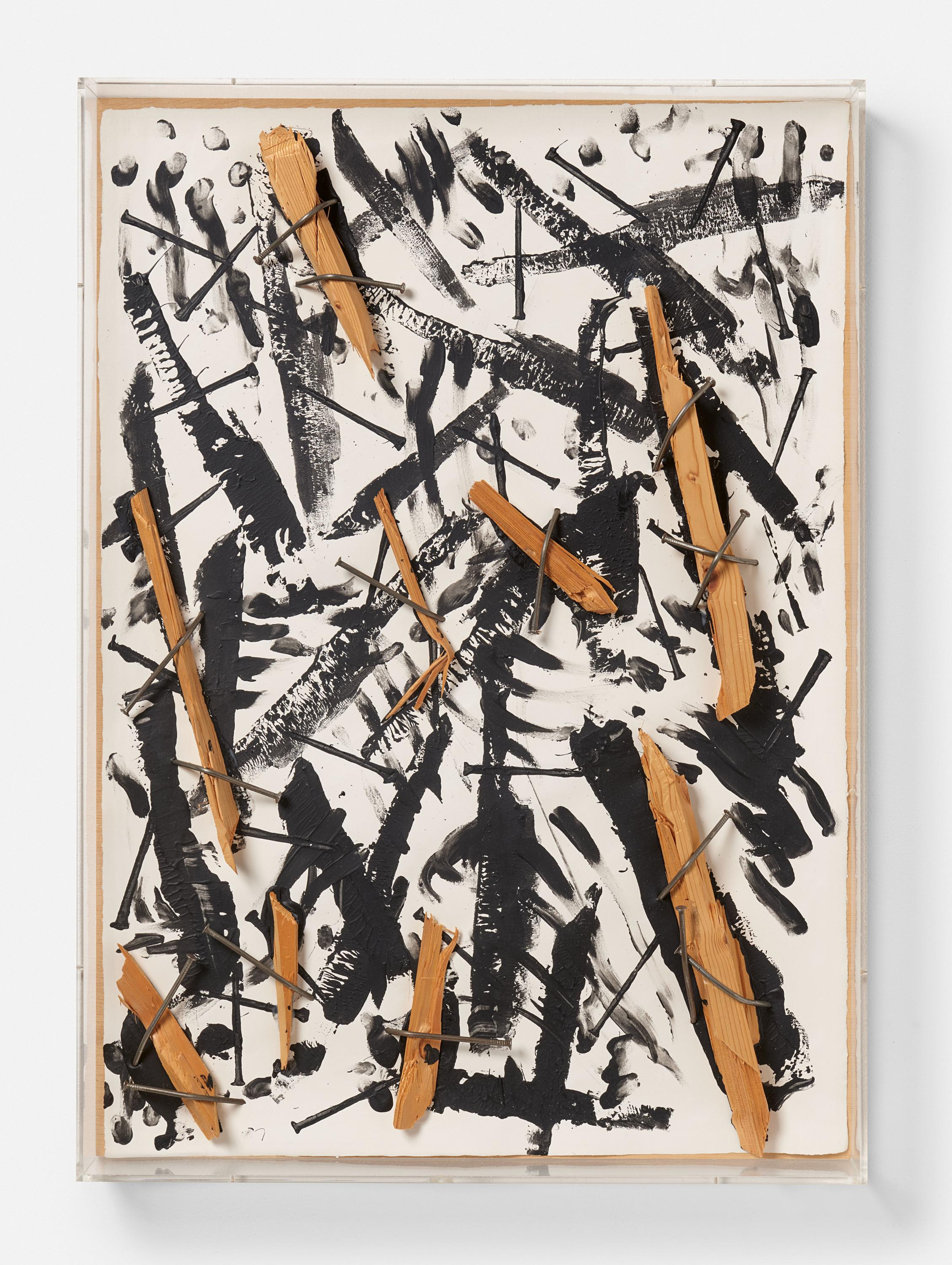 Acrylic, wood and nails on firm vellum, mounted on wooden panel