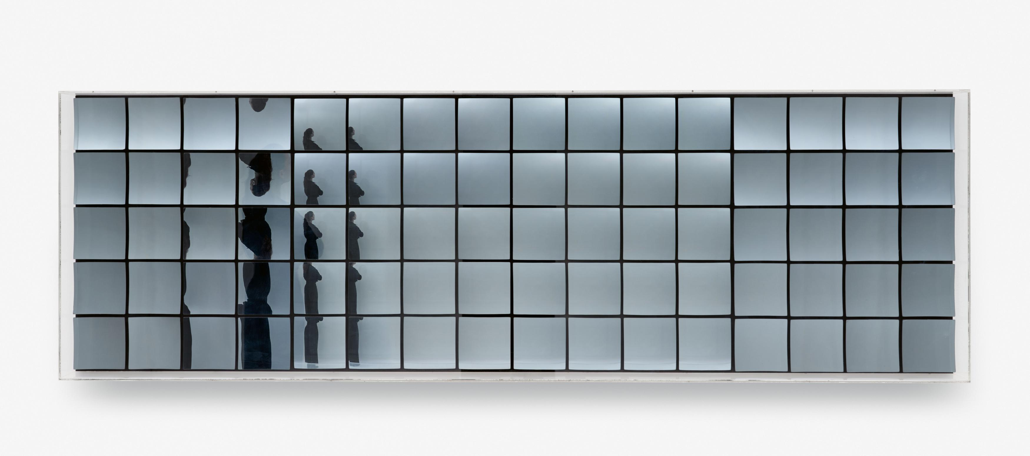 140 square mirrors, concave- and convex-curved, on black-framed wooden rear panel. In plexiglass box