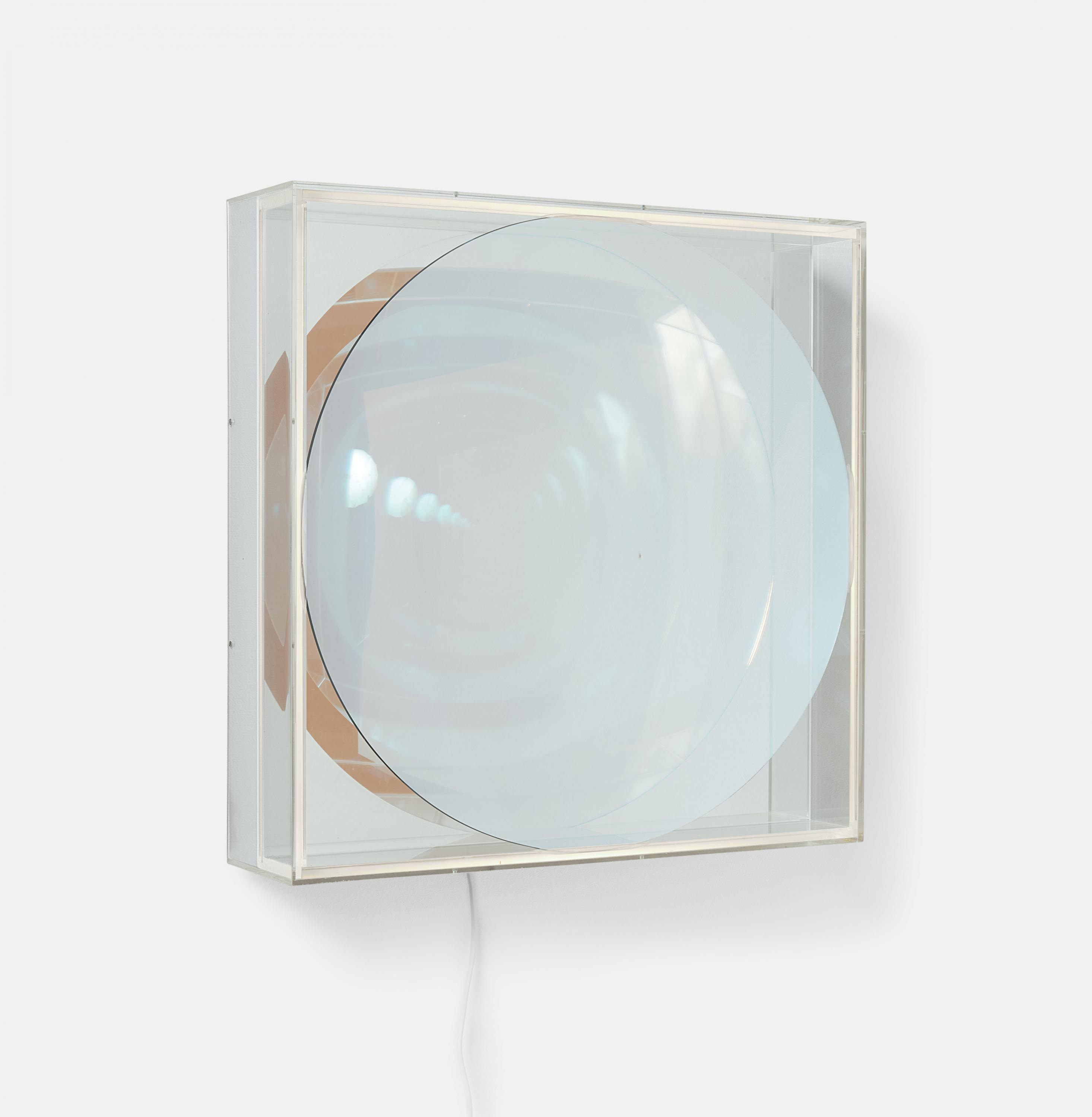 144 square mirrors on a concave-curved plexiglass board, on a black-framed wooden rear panel. In a plexiglass box